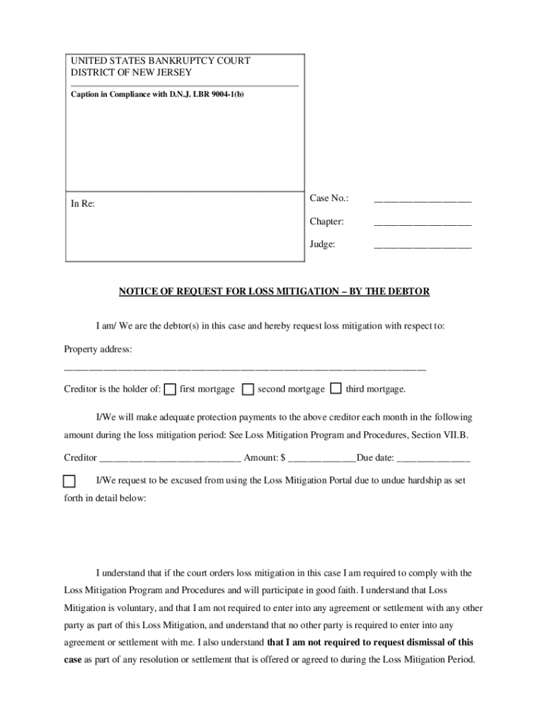 UNITED STATES BANKRUPTCY COURT DISTRICT OF NEW JERSEY Caption in Compliance with D.N.J. LB 90041(b)In Re:Case No.: Chapter: Judge: NOTICE OF REQUEST FOR LOSS MITIGATION BY THE DEBTOR am/ We are the