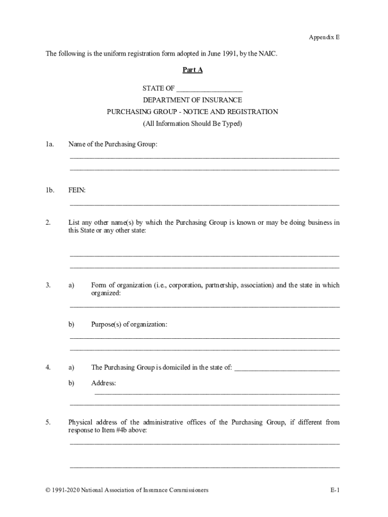 Appendix The following is the uniform registration form adopted in June 1991, by the NAIL. Part A STATE OF DEPARTMENT OF INSURANCE PURCHASING GROUP NOTICE AND REGISTRATION (All Information Should
