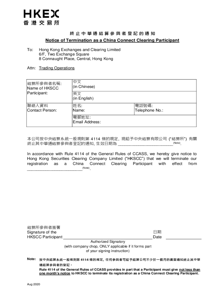 Notice of Termination as a China Connect Clearing Participant To:Hong Kong Exchanges and Clearing Limited 6/F, Two Exchange Square 8 Conn aught Place, Central, Hong Kong Attn: Trading Operations: