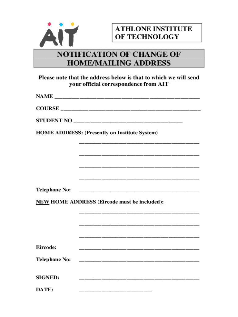 ALONE INSTITUTE OF TECHNOLOGYNOTIFICATION OF CHANGE OF HOME/MAILING ADDRESS Please note that the address below is that to which we will send your official correspondence from AIT NAME COURSE STUDENT