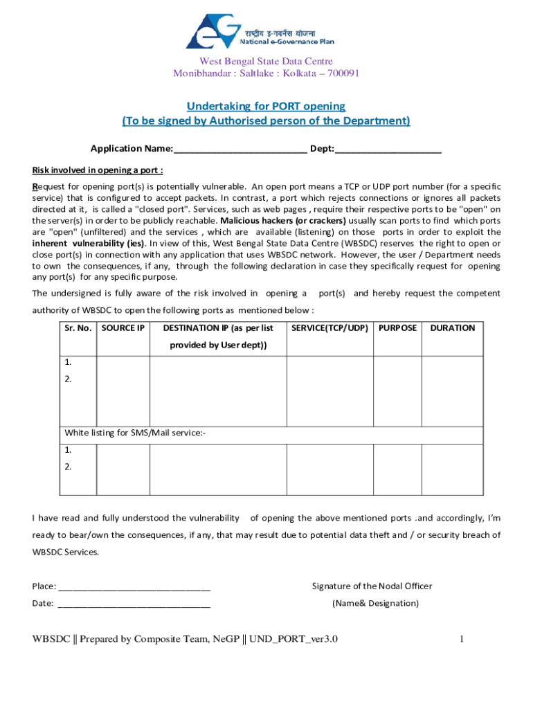 West Bengal State Data Center Monibhandar : Salt lake : Kolkata 700091Undertaking for PORT opening (To be signed by Authorized person of the Department) Application Name: Dept: Risk involved in opening