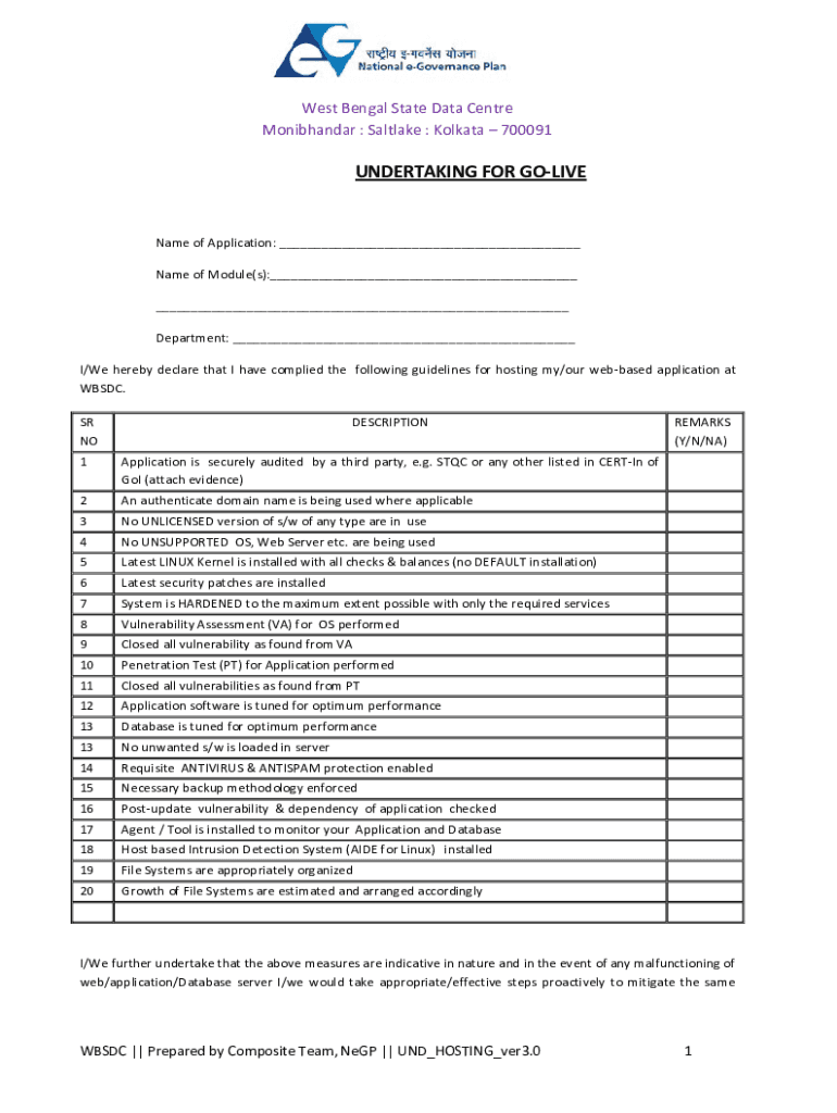 West Bengal State Data Center Monibhandar : Salt lake : Kolkata 700091UNDERTAKING FOR GOLIVEName of Application: Name of Module(s): Department: I/We hereby declare that I have complied the following