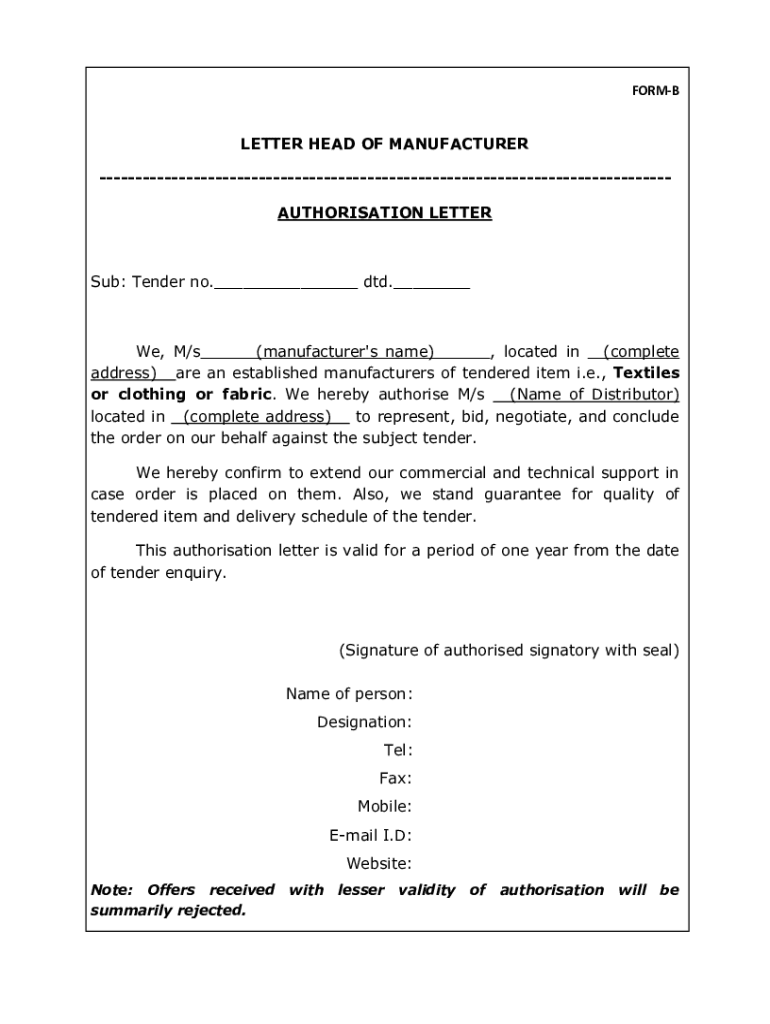 FORMATTER HEAD OF MANUFACTURER Authorization Letters: Tender no. did. We, M/s (manufacturer's name), located in (complete address) are an established manufacturer of tendered item i.e., Textiles or