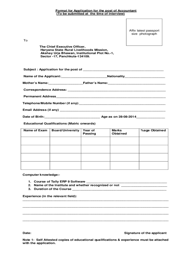 Get the free Format for Application for the post of Accountant - hsrlm gov