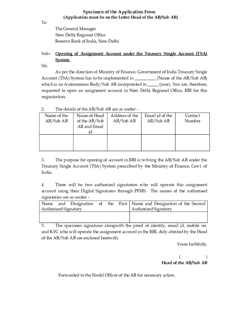 Specimen of the Application Form (Application must be on the Letter Head of the AB/Sub AB) To The General Manager New Delhi Regional Office Reserve Bank of India, New Delhi Sub:Opening of Assignment