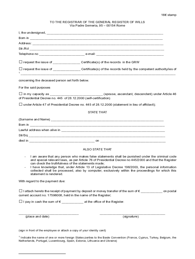 16 stamps TO THE REGISTRAR OF THE GENERAL REGISTER OF WILLS Via Padre Sumeria, 95 00154 Rome I, the undersigned, Born in Address: STR./Rd Telephone no email: request the issue of Certificate(s) of