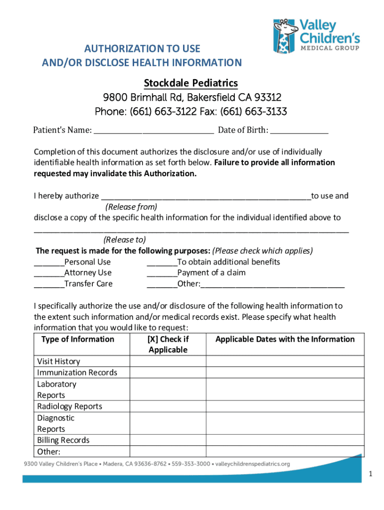 AUTHORIZATION TO USE AND/OR DISCLOSE HEALTH INFORMATION Stock dale Pediatrics 9800 Brim hall Rd, Bakersfield CA 93312 Phone: (661) 6633122 Fax: (661) 6633133 Patients Name: Date of Birth: Completion