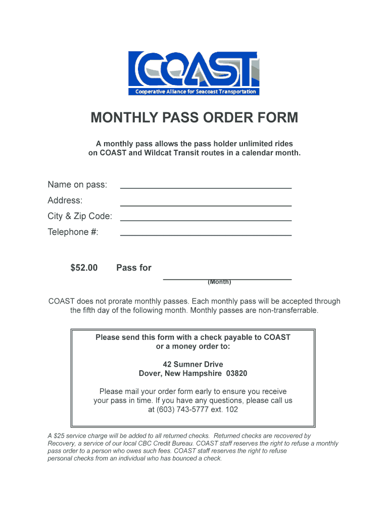 The Monthly Pass Order Form requires payment via check or money order to be sent to the designated address in Dover, New Hampshire.