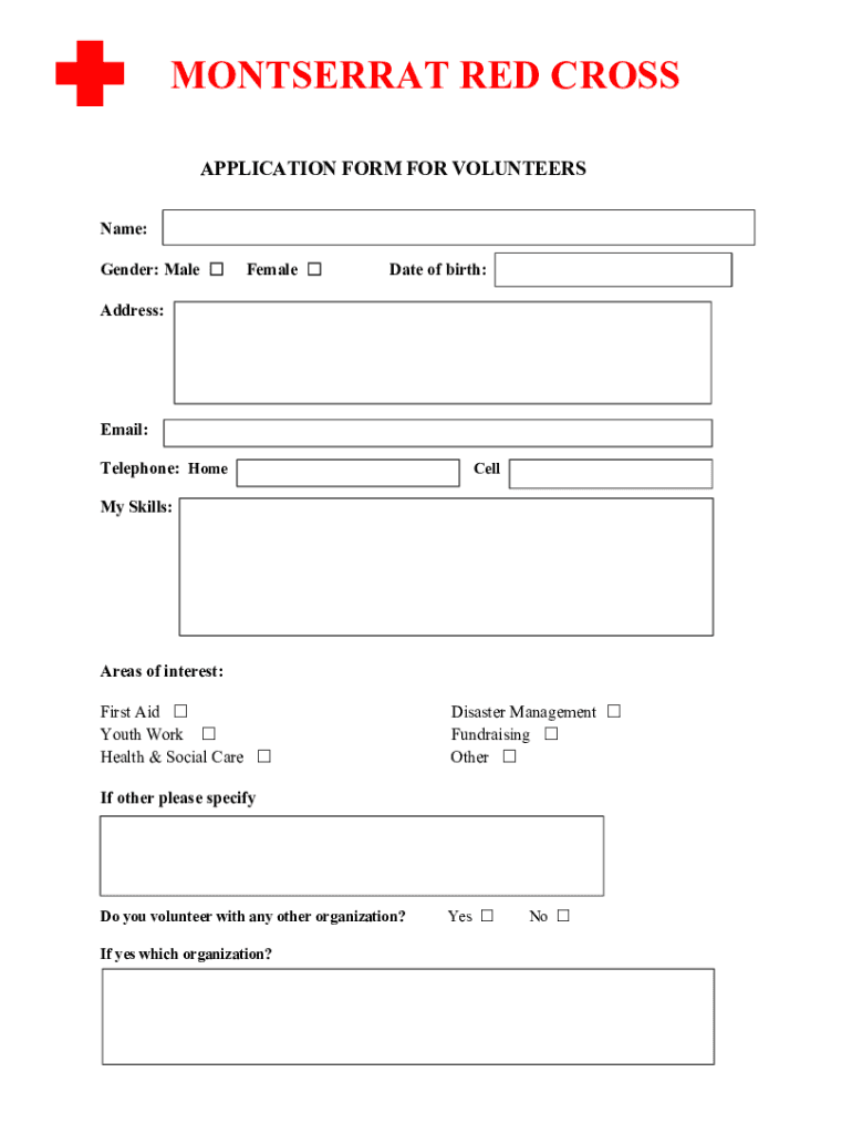 MONTSERRAT RED CROSS APPLICATION FORM FOR VOLUNTEERS Name: Gender: Male Female Date of birth:Address:Email: Telephone: HomeCellMy Skills:Areas of interest: First Aid Youth Work Health & Social Care