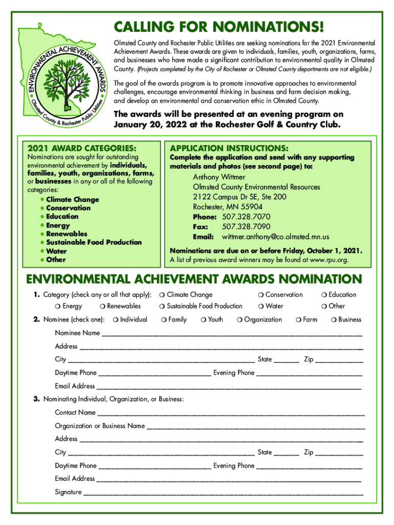 CALLING FOR NOMINATIONS! Olmsted County and Rochester Public Utilities are seeking nominations for the 2021 Environmental Achievement Awards. These awards are given to individuals, families, youth,