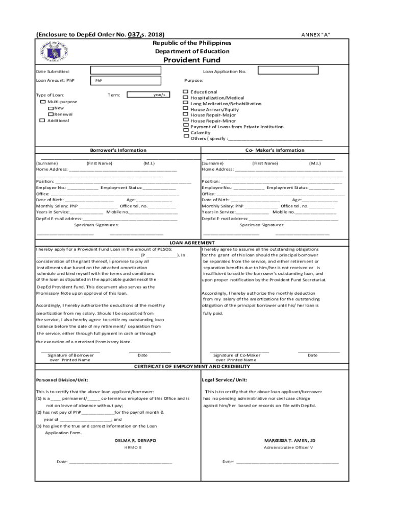 (Enclosure to Depend on Order No. 037’s. 2018) Republic of the Philippines Department of EducationANNEX “A “Provident Candidate Submitted:Loan Application No. Loan Amount: Purpose:Type of Loan:Term:Educational