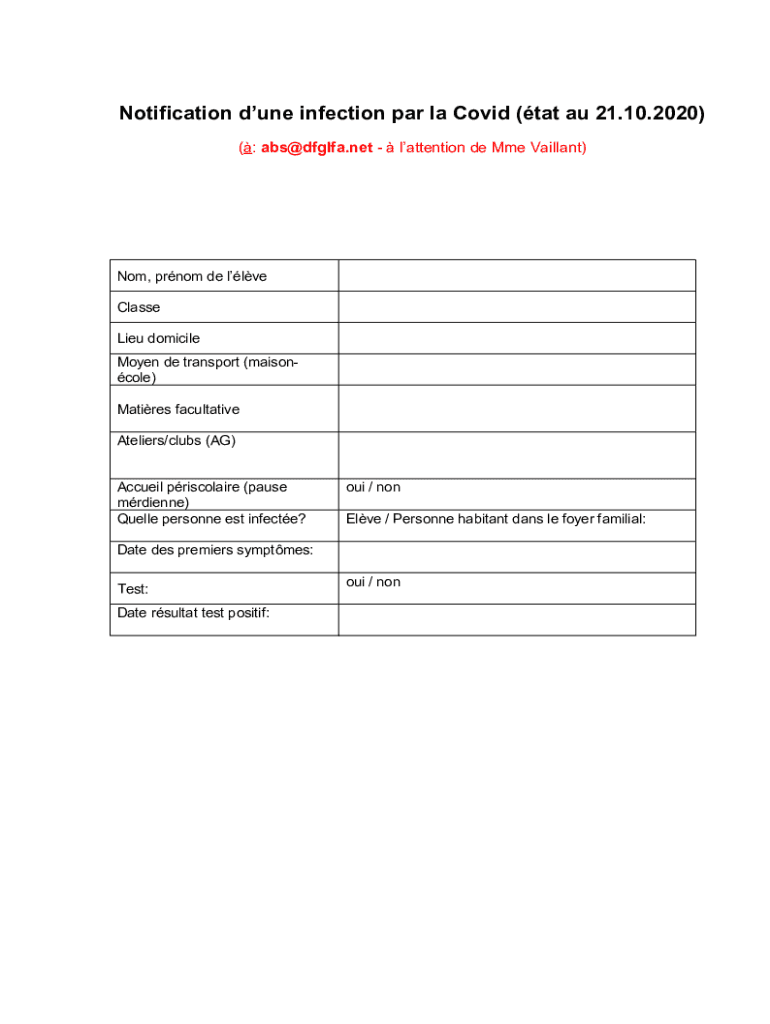 Notification dune infection par la COVID-19 (that Au 21.10.2020) (: abs@dfglfa.net attention de Mme Gallant)Not, prom DE love Class Lieu domicileMoyen de transport (maisonette) Matures facultative