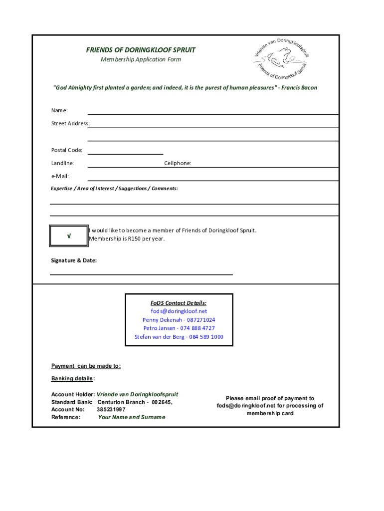 FRIENDS OF DORINGKLOOF SPR UIT Membership Application Form “God Almighty first planted a garden; and indeed, it is the purest of human pleasures Francis Bacon Name: Street Address:Postal Code: Landline:Cellphone:email: