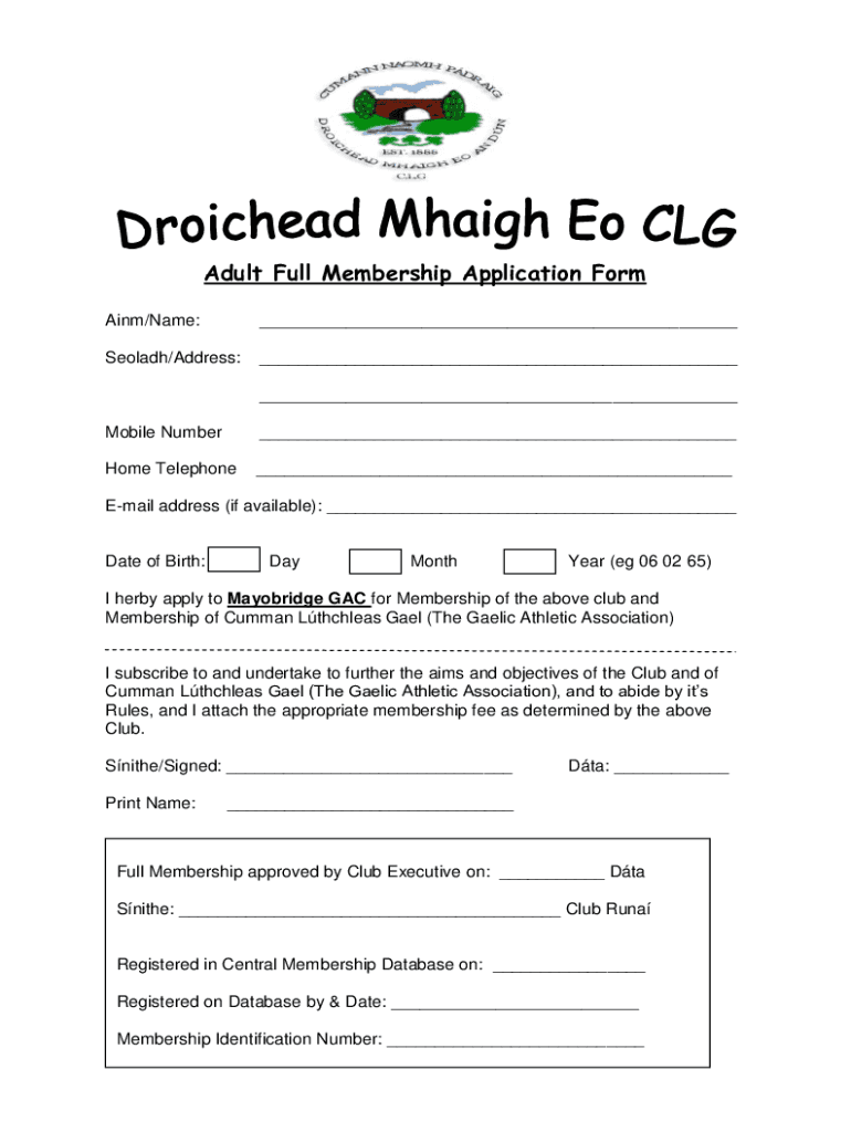 Adult Full Membership Application Form Ainu/Name: Sold/Address: Mobile Number Home Telephone Email address (if available): Date of Birth:DayMonthYear (e.g. 06 02 65)I herby apply to Mayo bridge GAC