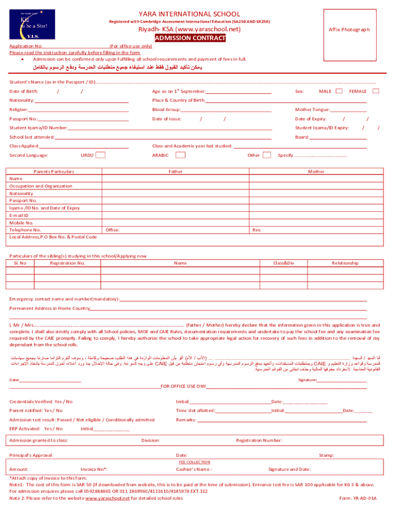 YARD INTERNATIONAL SCHOOL Registered with Cambridge Assessment International Education (SA250 AND SX250)Riyadh KSA (www.yaraschool.net) ADMISSION CONTRACTAffix PhotographApplication No: (For office