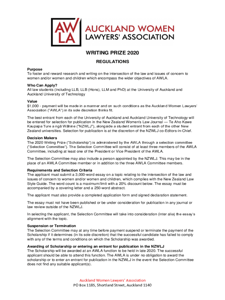 WRITING PRIZE 2020 REGULATIONS Purpose To foster and reward research and writing on the intersection of the law and issues of concern to women and/or women and children which encompass the wider objectives