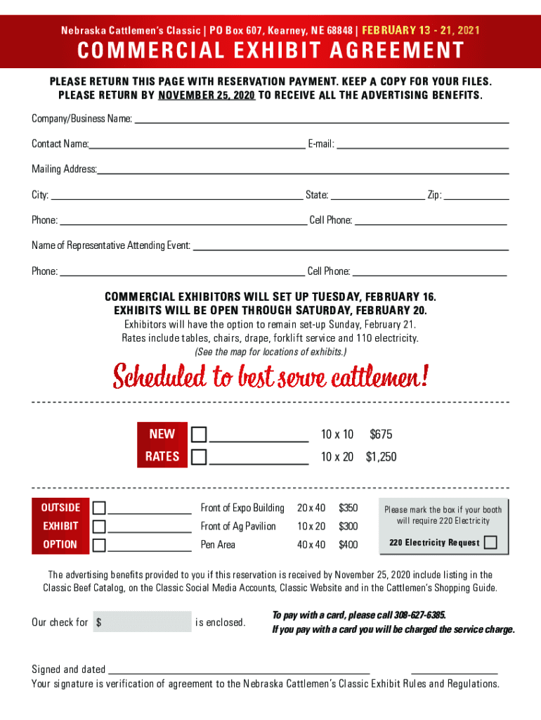 Nebraska Cattlemen Classic PO Box 607, Kearney, NE 68848 FEBRUARY 13 21, 2021COMMERCIAL EXHIBIT AGREEMENTPLEASE RETURN THIS PAGE WITH RESERVATION PAYMENT. KEEP A COPY FOR YOUR FILES. PLEASE RETURN