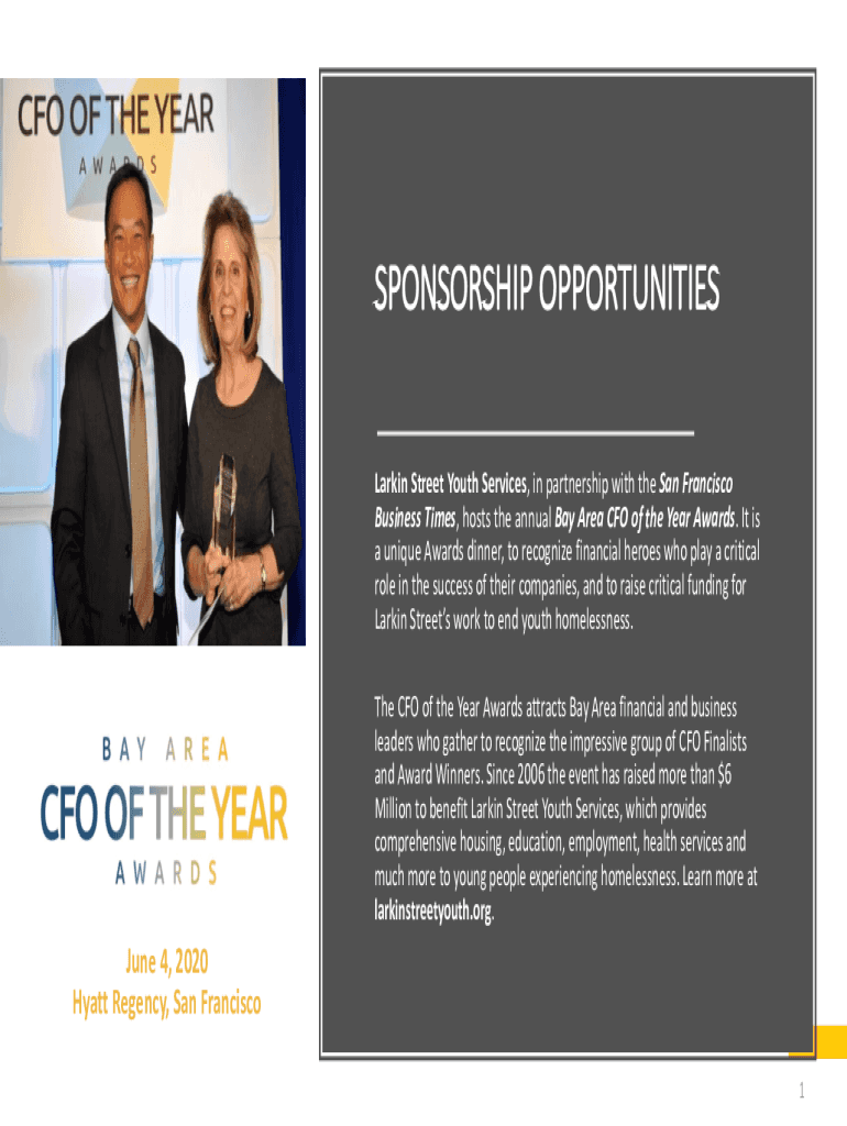 SPONSORSHIP OPPORTUNITIES Larking Street Youth Services, in partnership with the San Francisco Business Times, hosts the annual Bay Area CFO of the Year Awards. It is a unique Awards dinner, to recognize