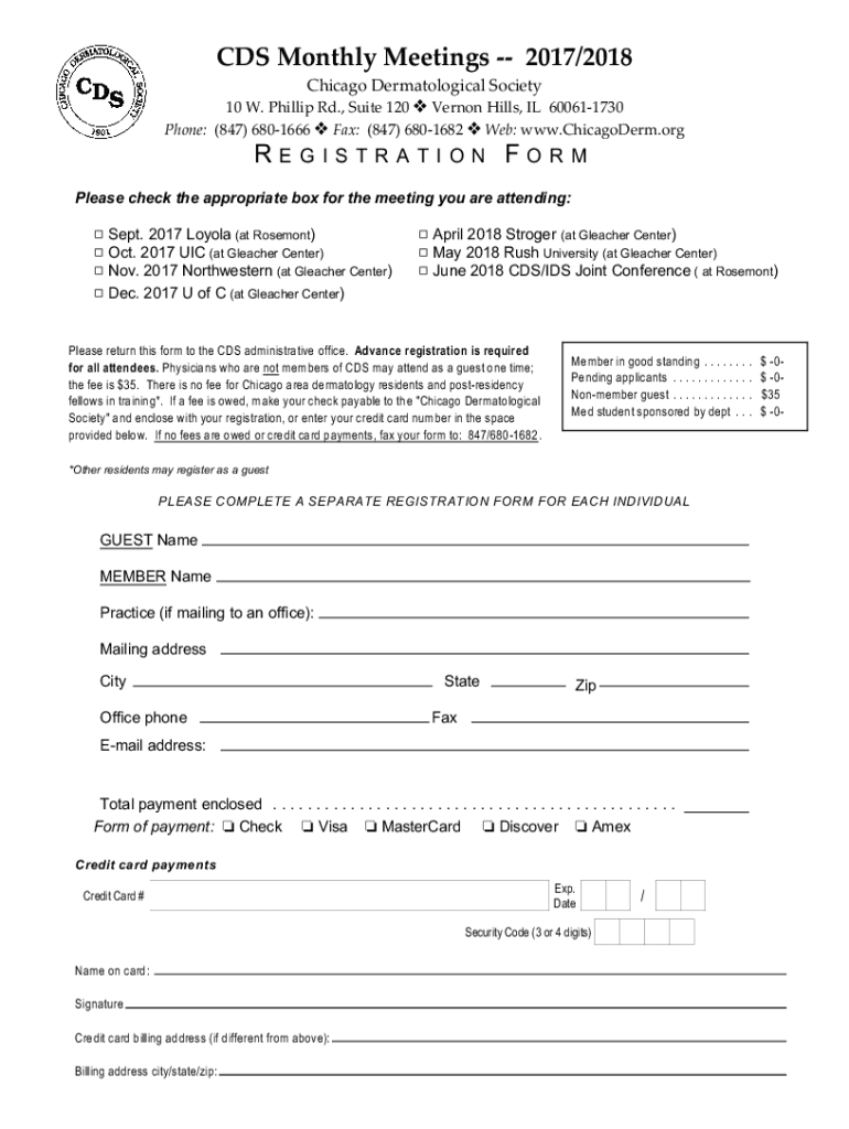CDS Monthly Meetings 2017/2018 Chicago Dermatological Society 10 W. Phillip Rd., Suite 120 Vernon Hills, IL 600611730 Phone: (847) 6801666 Fax: (847) 6801682 Web: www.ChicagoDerm.orgREGISTRATIONFORMPlease