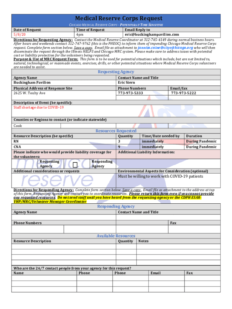 Medical Reserve Corps Request CHICAGO MEDICAL RESERVE CORPS POTENTIALLY TIME SENSITIVE Date of Request Time of Request Email Reply to 5/8/20 4pm eric@buckinghampavilion.com Directions for Requesting