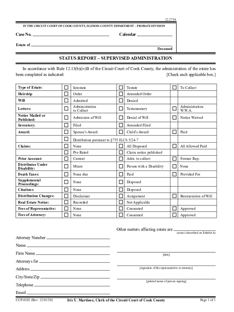 2754 IN THE CIRCUIT COURT OF COOK COUNTY, ILLINOIS COUNTY DEPARTMENT PROBATE DIVISION Case No. CalendarEstate ofDeceasedSTATUS REPORT SUPERVISED ADMINISTRATION In accordance with Rule 12.13(b)(iv)B