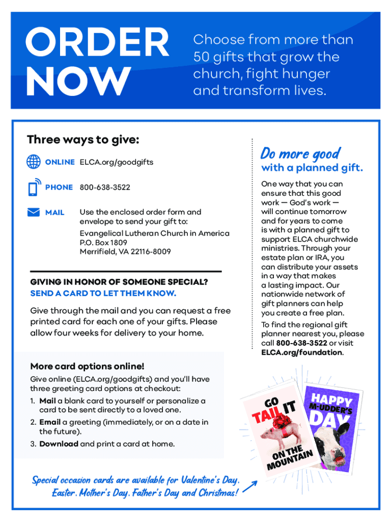 ORDER Choose from more than 50 gifts that grow the church, fight hunger and transform lives. Three ways to give:Do more guideline ELCA.org/goodgiftswith a planned gift. One way that you can ensure