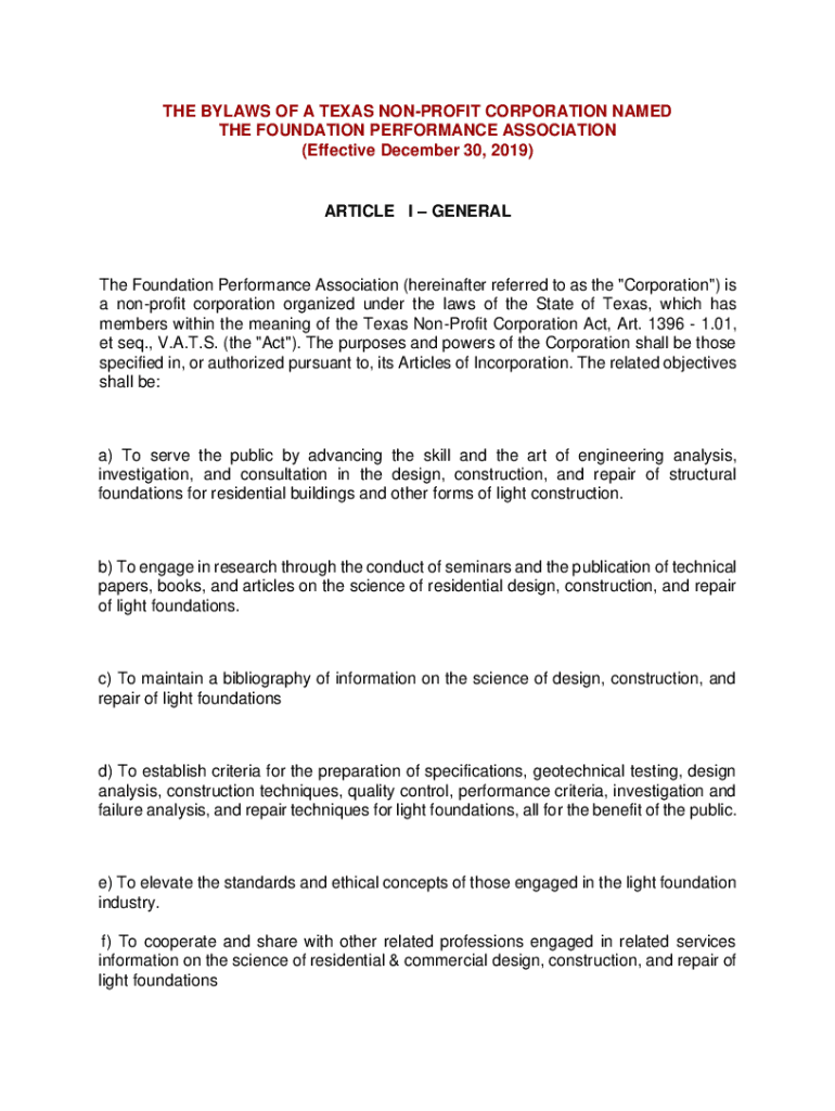 THE BYLAWS OF A TEXAS NONPROFIT CORPORATION NAMED THE FOUNDATION PERFORMANCE ASSOCIATION (Effective December 30, 2019)ARTICLE I Generate Foundation Performance Association (hereinafter referred to