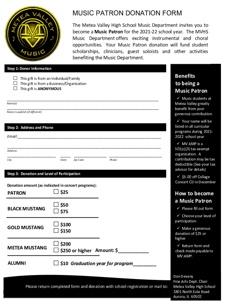 MUSIC PATRON DONATION From The Meter Valley High School Music Department invites you to become a Music Patron for the 202122 school year. The VHS Music Department offers exciting instrumental and
