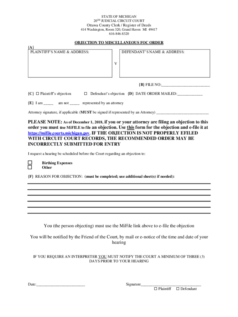STATE OF MICHIGAN 20TH JUDICIAL CIRCUIT COURT Ottawa County Clerk / Register of Deeds 414 Washington, Room 320, Grand Haven MI 49417 6168468320OBJECTION TO MISCELLANEOUS FOC ORDER A PLAINTIFFS NAME