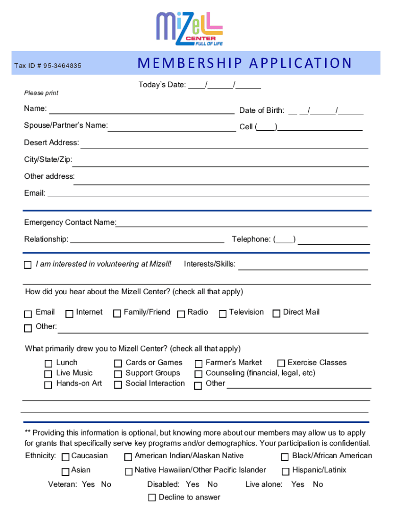 Tax ID # 953464835M E M B E R S H I P A P P L I C AT I O N Today's Date: / / Please printable:Date of Birth: / / Spouse/Partners Name:Cell () Desert Address:City/State/Zip: Other address: Email: Emergency
