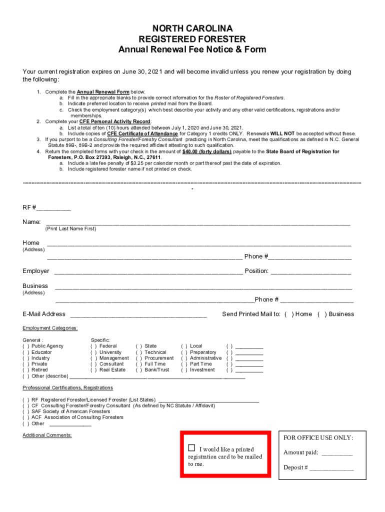 NORTH CAROLINA REGISTERED FORESTER Annual Renewal Fee Notice & Form Your current registration expires on June 30, 2021, and will become invalid unless you renew your registration by doing the following: