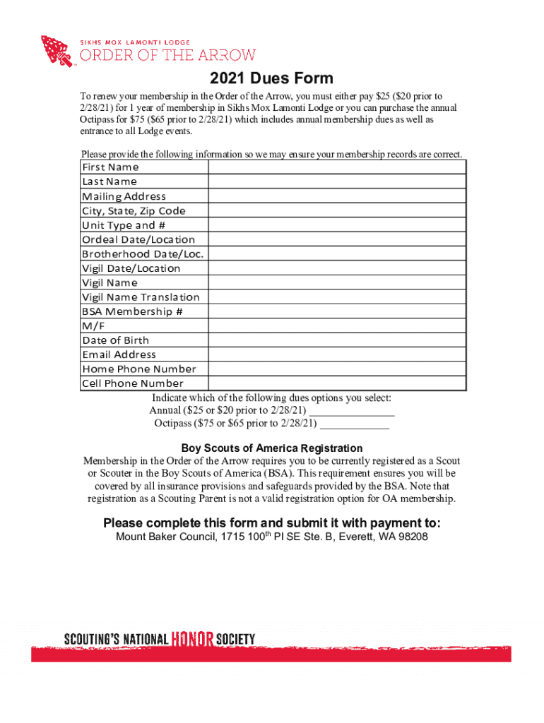 2021 Dues Form To renew your membership in the Order of the Arrow, you must either pay $25 ($20 prior to 2/28/21) for 1 year of membership in Sikhs MOX Lamont Lodge or you can purchase the annual