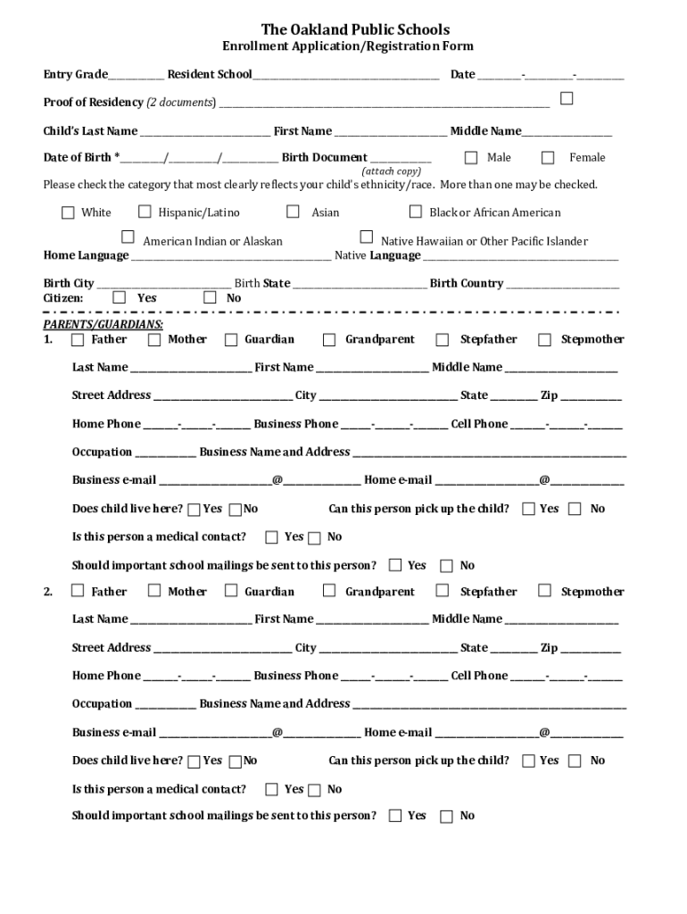 The Oakland Public SchoolsEnrollment Application/Registration Forestry Grade Resident School Date Proof of Residency (2 documents) Child's Last Name First Name Middle Name Date of Birth * / / Birth