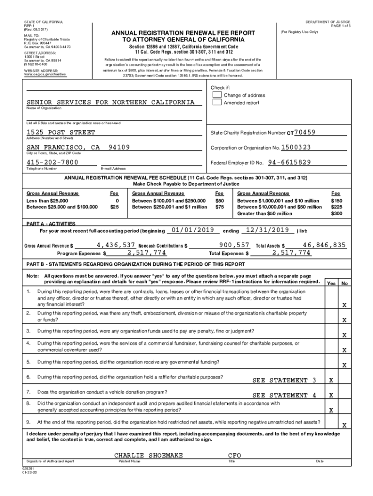 DEPARTMENT OF JUSTICE PAGE 1 of 5STATE OF CALIFORNIA RRF1 (Rev. 09/2017) MAIL TO: Registry of Charitable Trusts P.O. Box 903447 Sacramento, CA 942034470 STREET ADDRESS: 1300 I Street Sacramento, CA