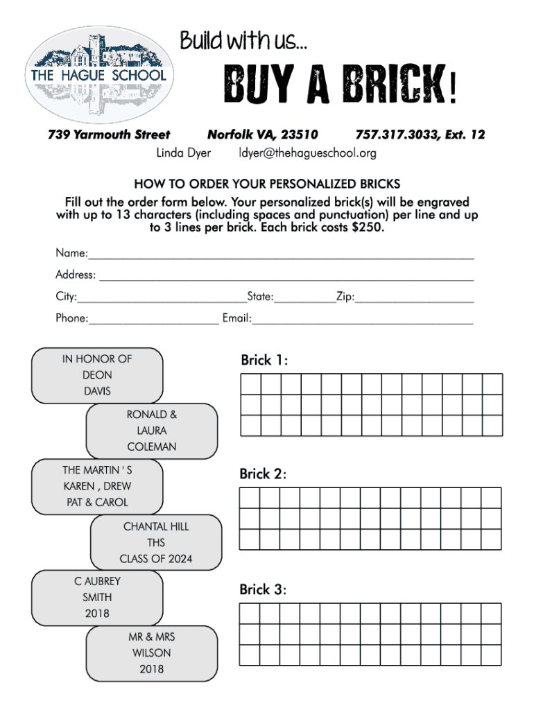 Build w it h us...BUY A BRICK! 739 Yarmouth Street Norfolk VA, 23510 757.317.3033, Ext. 12 Linda Dyer layer thehagueschool.org HOW TO ORDER YOUR PERSONALIZED BRICKS Fill out the order form below.