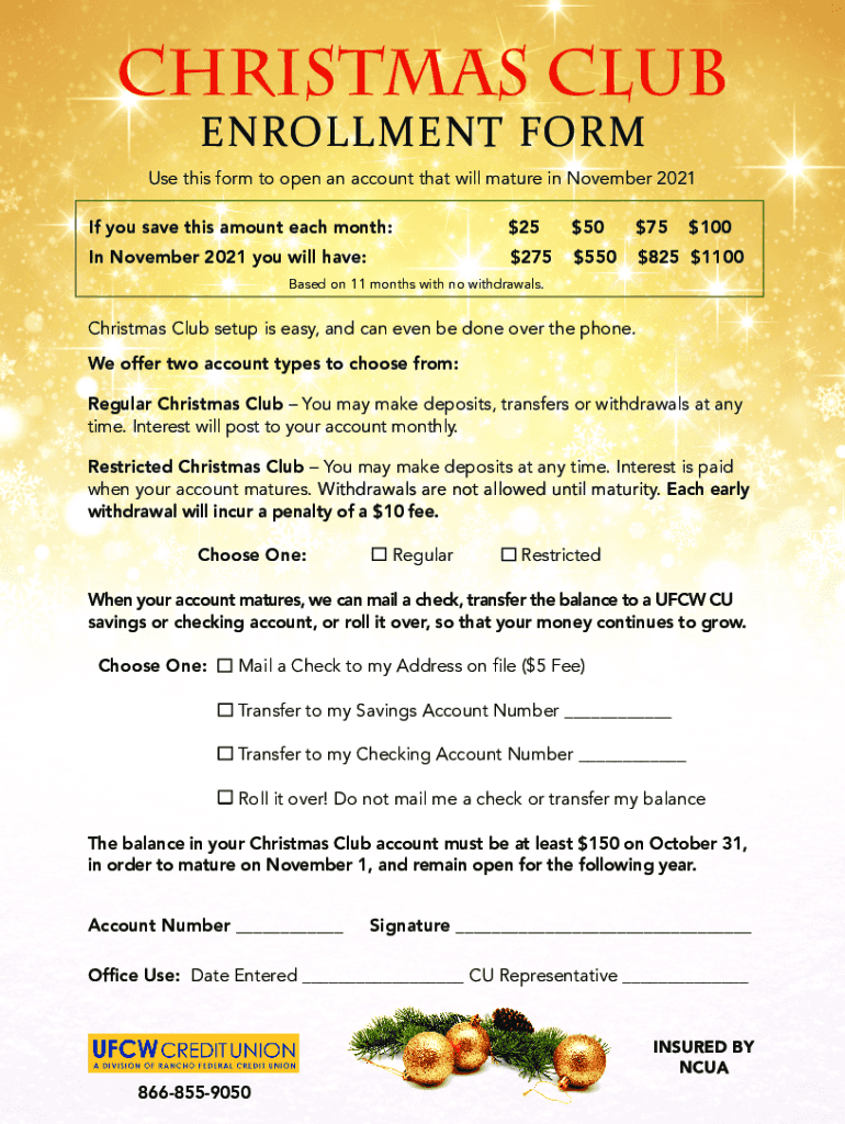 Christmas Club ENROLLMENT Forms this form to open an account that will mature in November 2021 If you save this amount each month:$$$$255075100In November 2021 you will have:$$$$2755508251100Based