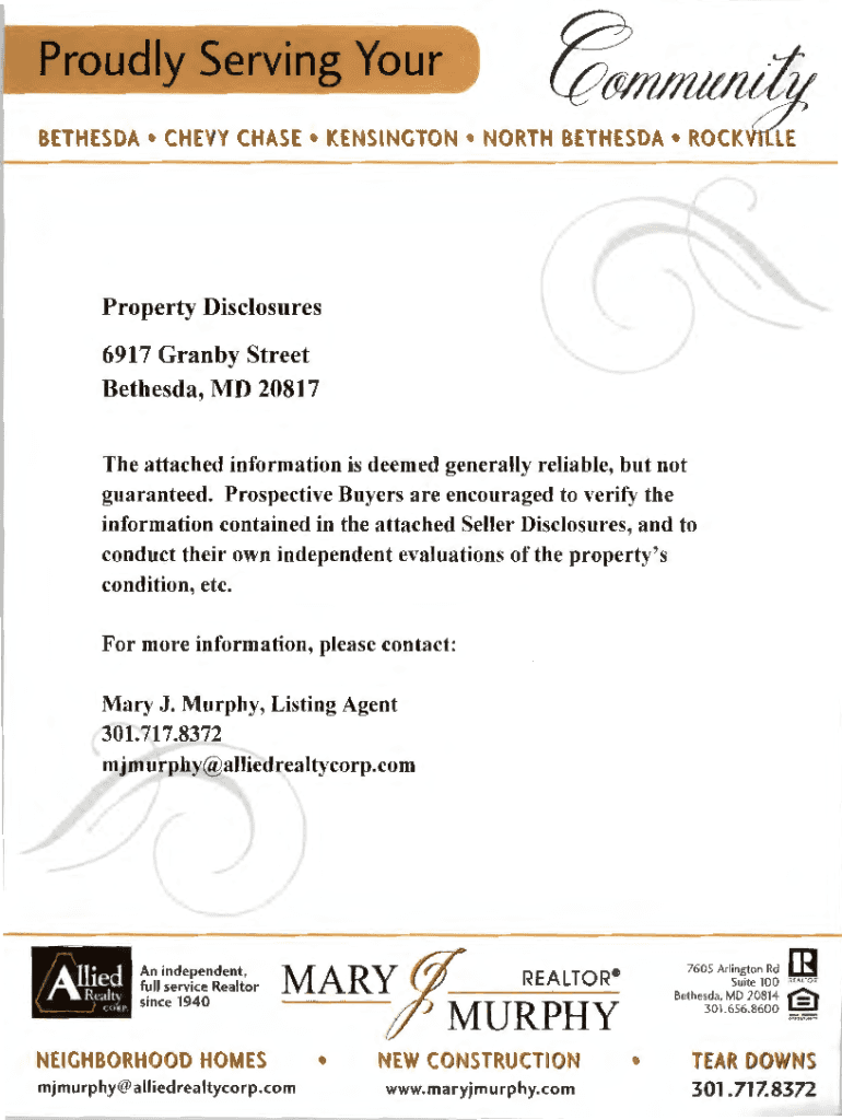 Proudly Serving YourProperty Disclosures 6917 Granby Street Bethesda, MD 20817 The attached information is deemed generally reliable, but not guaranteed. Prospective Buyers are encouraged to verify