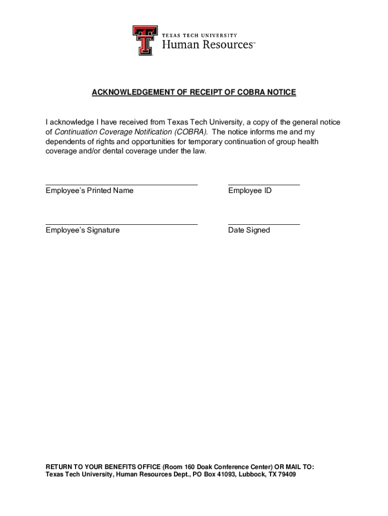 ACKNOWLEDGEMENT OF RECEIPT OF COBRA NOTICE acknowledge I have received from Texas Tech University, a copy of the general notice of Continuation Coverage Notification (COBRA). The notice informs me