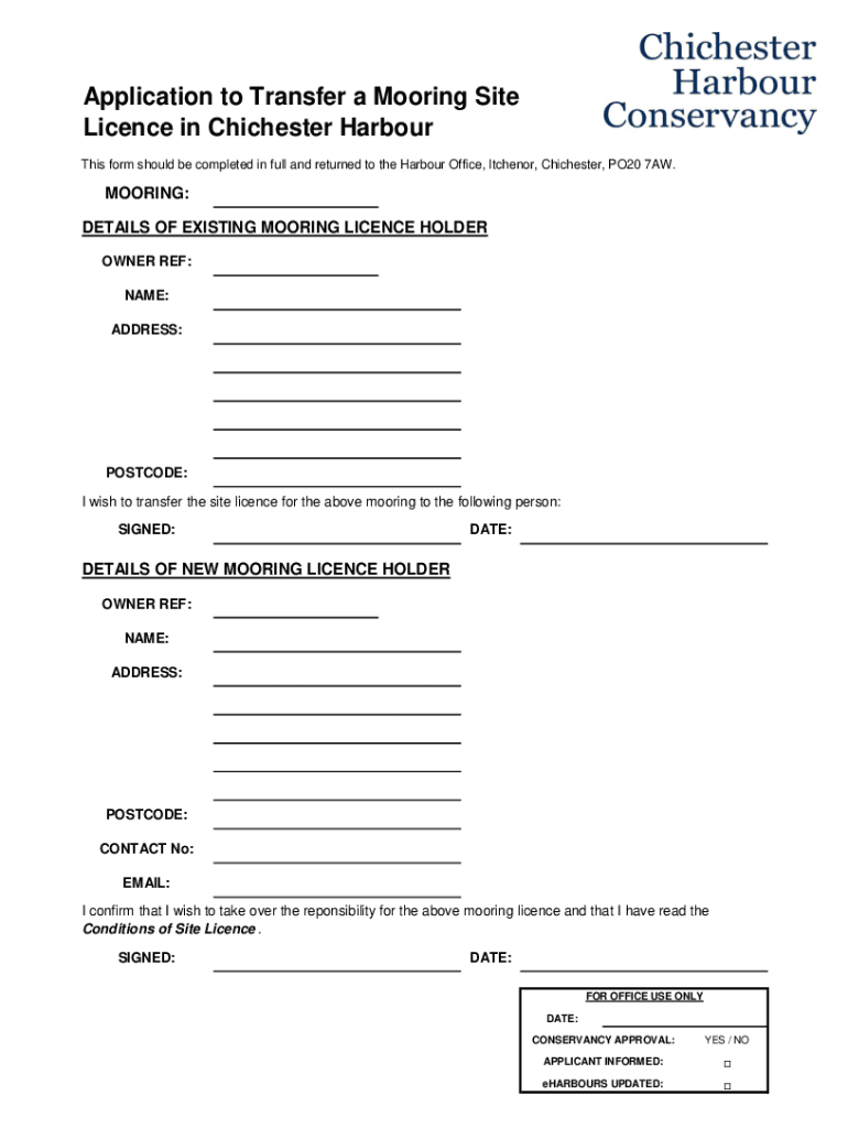 Application to Transfer a Mooring Site License in Colchester Harbor This form should be completed in full and returned to the Harbor Office, Kitchener, Colchester, PO20 7AW.MOORING: DETAILS OF EXISTING