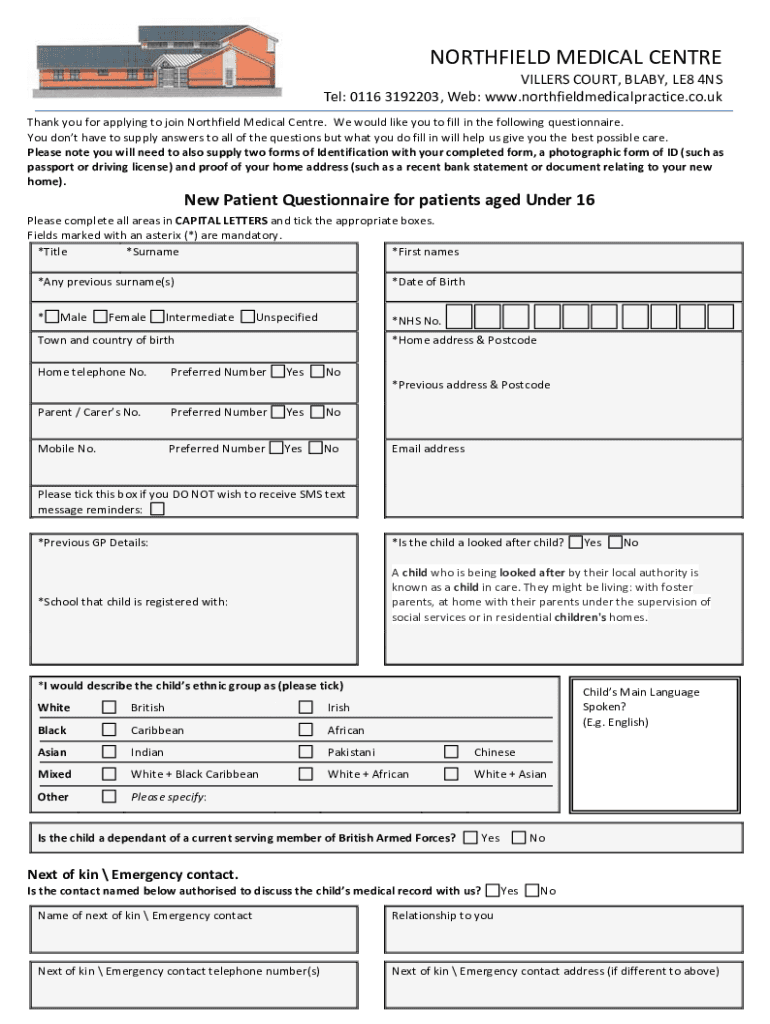 NORTHFIELD MEDICAL Center KILLERS COURT, BABY, LE8 4NS Tel: 0116 3192203, Web: www.northfieldmedicalpractice.co.uk Thank you for applying to join Northfield Medical Center. We would like you to fill