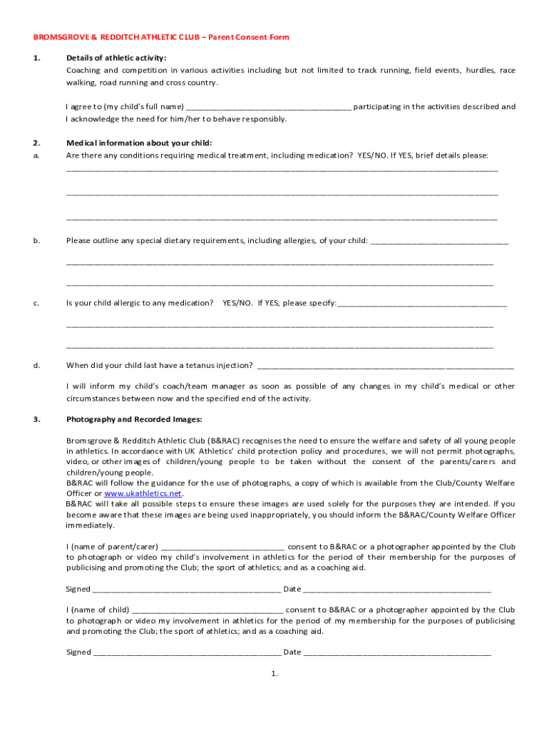 Get the free BROMSGROVE & REDDITCH ATHLETIC CLUB Parent Consent Form