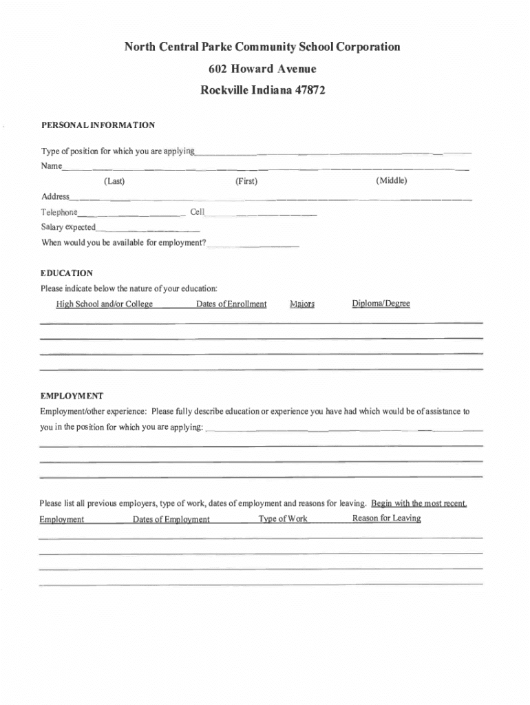 North Central Park Community School Corporation 602 Howard Avenue Rockville Indiana 47872 PERSONAL INFORMATIONType of position for which you are applying Name(Middle)(First)(Last) Addressee 1 e phone