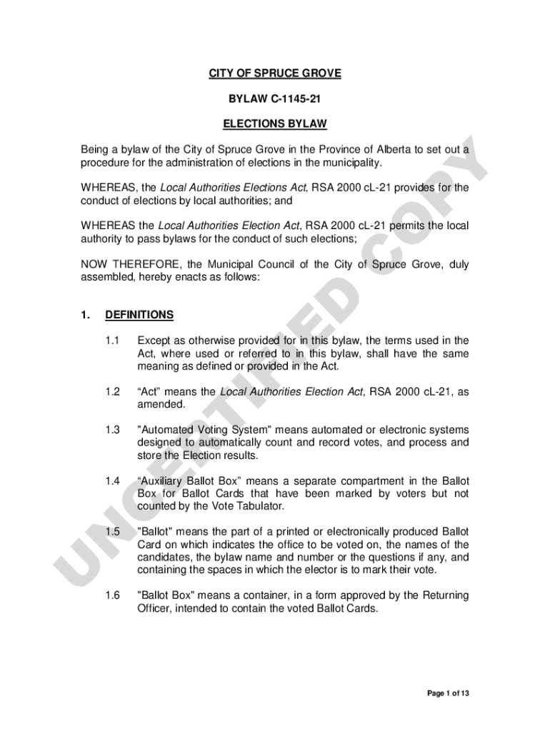 CITY OF SPRUCE GROVE BYLAW C114521 ELECTIONS BYLAWYBeing a bylaw of the City of Spruce Grove in the Province of Alberta to set out a procedure for the administration of elections in the municipality.