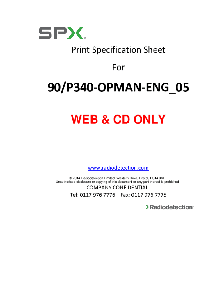 Print Specification Sheet For90/P340OPMANENG 05 WEB & CD ONLY.www.radiodetection.com 2014 Radio detection Limited. Western Drive, Bristol, BS14 0AF Unauthorized disclosure or copying of this document