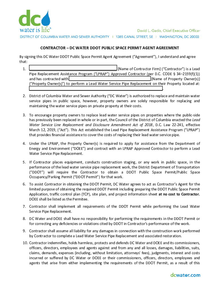 CONTRACTOR DC WATER DOT PUBLIC SPACE PERMIT AGENT AGREEMENT By signing this DC Water DOT Public Space Permit Agent Agreement (Agreement), I understand and agree that: 1. Name of Contractor Firm (Contractor)