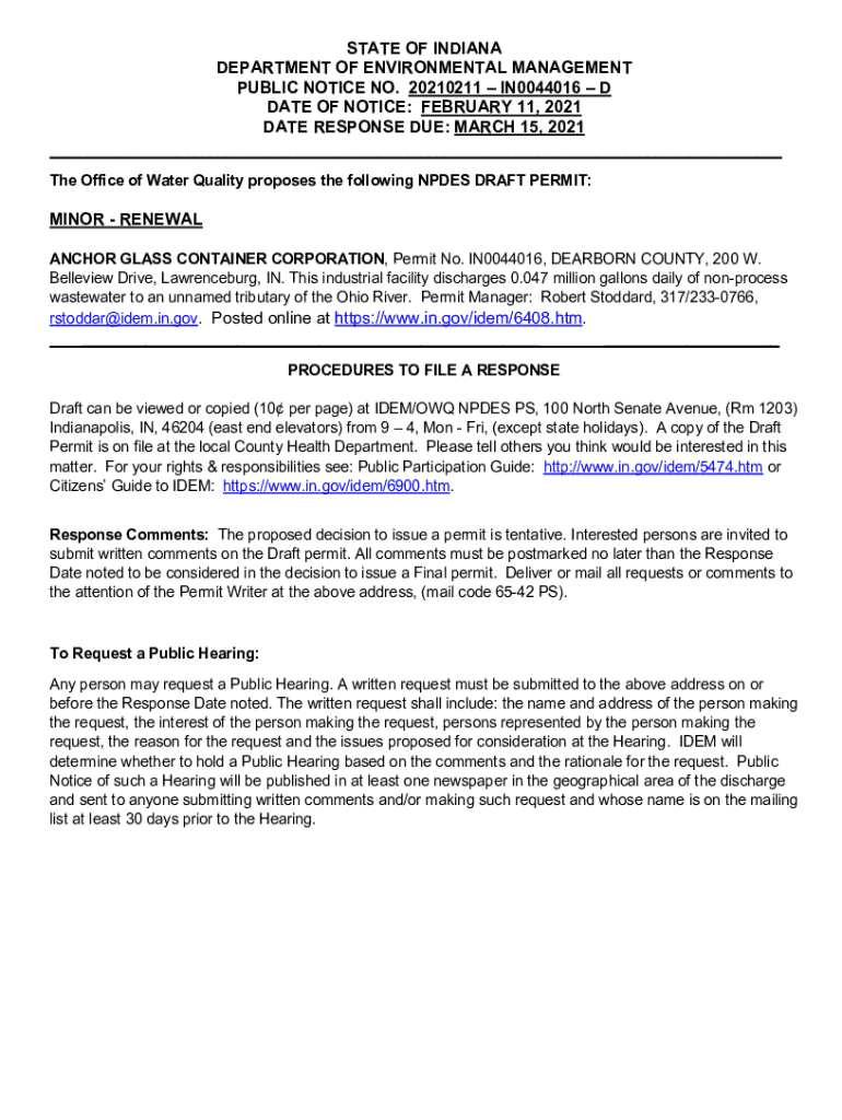 STATE OF INDIANA DEPARTMENT OF ENVIRONMENTAL MANAGEMENT PUBLIC NOTICE NO. 20210211 IN0044016 D DATE OF NOTICE: FEBRUARY 11, 2021, DATE RESPONSE DUE: MARCH 15, 2021, The Office of Water Quality proposes