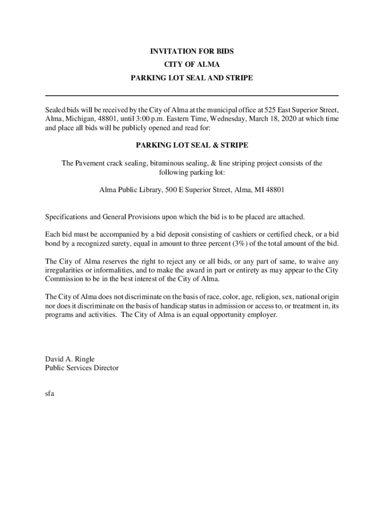 INVITATION FOR BIDS CITY OF ALMA PARKING LOT SEAL AND Stripteased bids will be received by the City of Alma at the municipal office at 525 East Superior Street, Alma, Michigan, 48801, until 3:00 p.m.