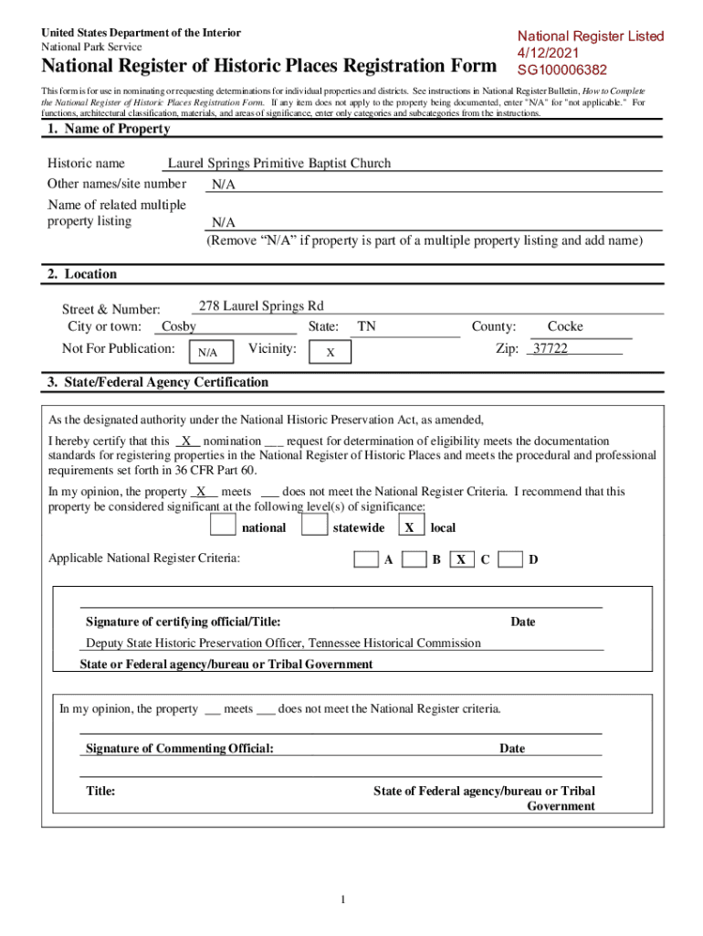 National Register Listed 4/12/2021 SG100006382United States Department of the Interior National Park ServiceNational Register of Historic Places Registration Forms form is for use in nominating or