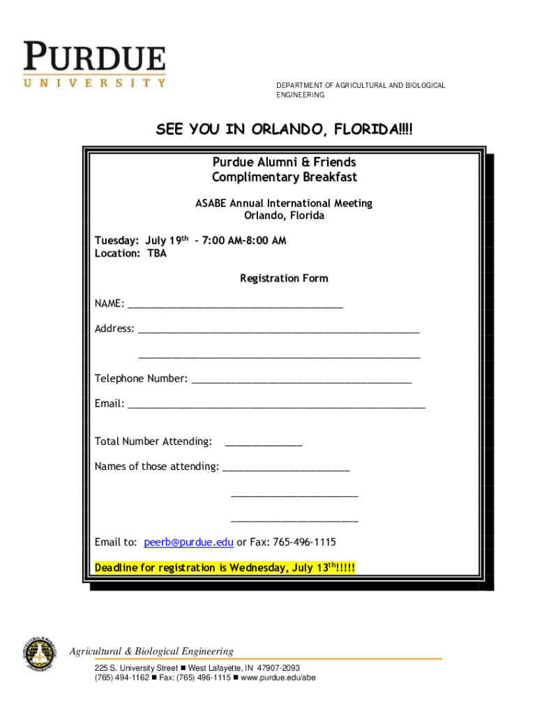 DEPARTMENT OF AGRICULTURAL AND BIOLOGICAL ENGINEERING YOU IN ORLANDO, FLORIDA!!!! Purdue Alumni & Friends Complimentary Breakfast SAME Annual International Meeting Orlando, Florida Tuesday: July 19th