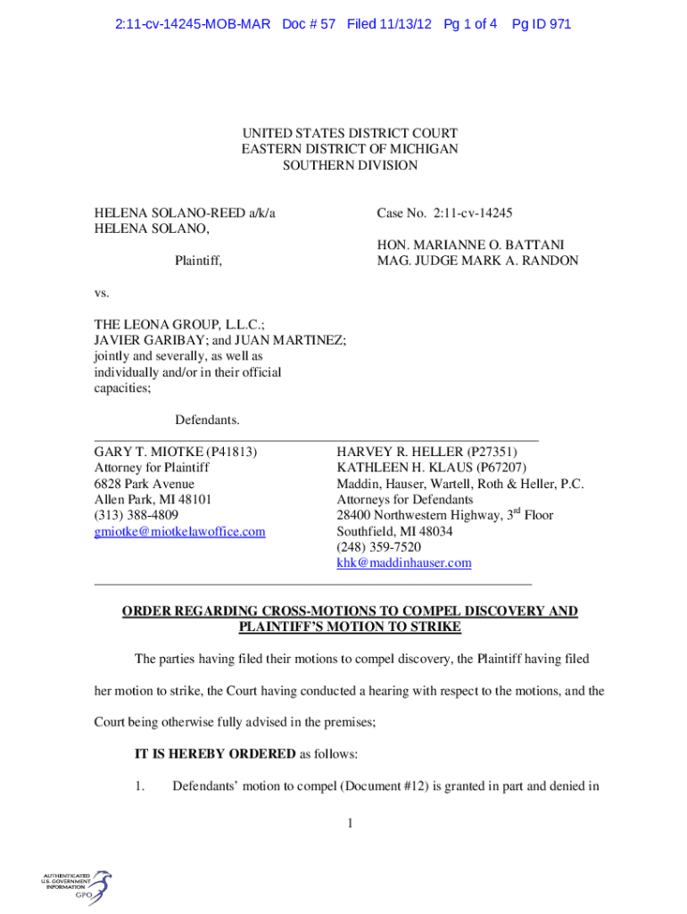 2:11cv14245MOBMAR Doc # 57 Filed 11/13/12 Pg 1 of 4Pg ID 971UNITED STATES DISTRICT COURT EASTERN DISTRICT OF MICHIGAN SOUTHERN DIVISIONHELENA SOLANOREED a/k/a HELENA SOLANO, Case No. 2:11cv14245 HON.